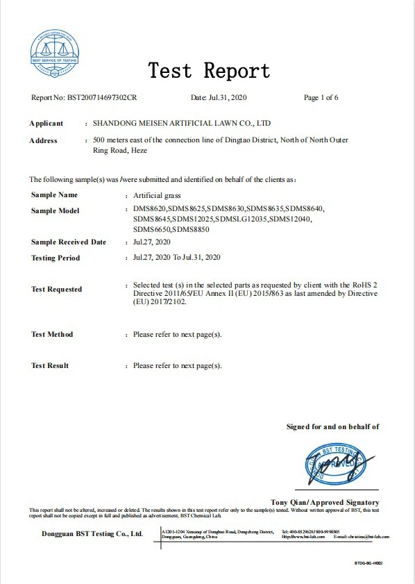 Έκθεση δοκιμής του ROHS Tested Artificial Gras Garden Turf